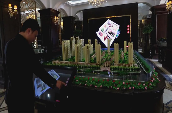 數字沙盤可通過互動系統,客戶可以自助地進行樓盤信息和戶型的了解,點出一個戶型,就可以跟隨鏡頭對戶型進行參觀,可以自由地控制鏡頭的走向,可以更加隨意自由地對房屋內的設計進行參觀。臥室、客廳、廚房等都呈現在觀眾面前。互動系統設計極具人性化,每一個細節都為客戶考慮,客戶購買房子所關心的一切都可以在系統上體現。