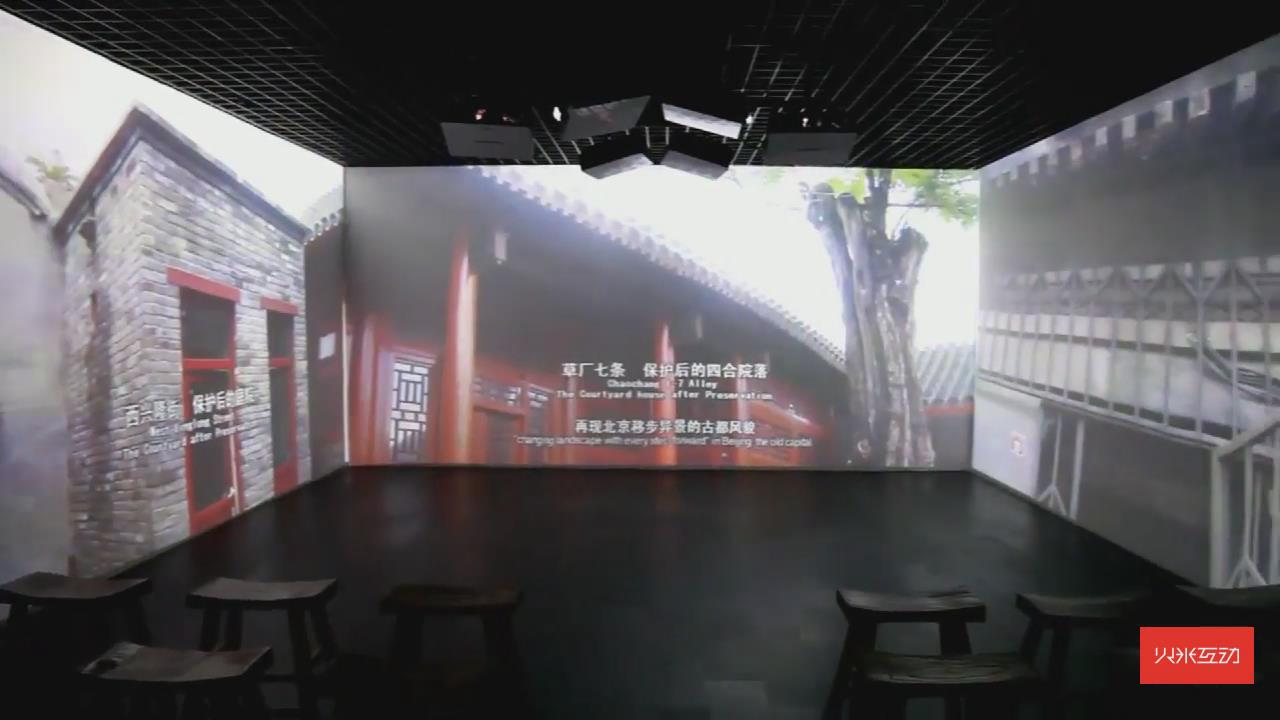 通過沉浸式三折幕投影展示了北京四合院的古都風貌,再配上立體聲效,能夠有強力的視聽沖擊感。